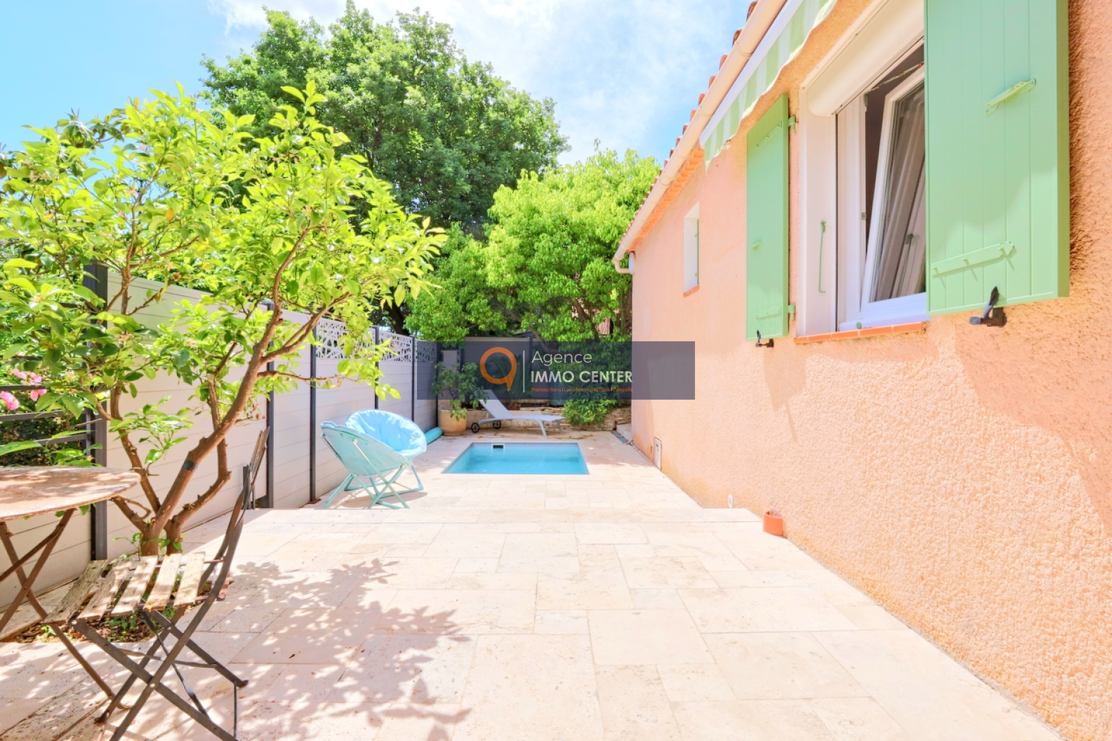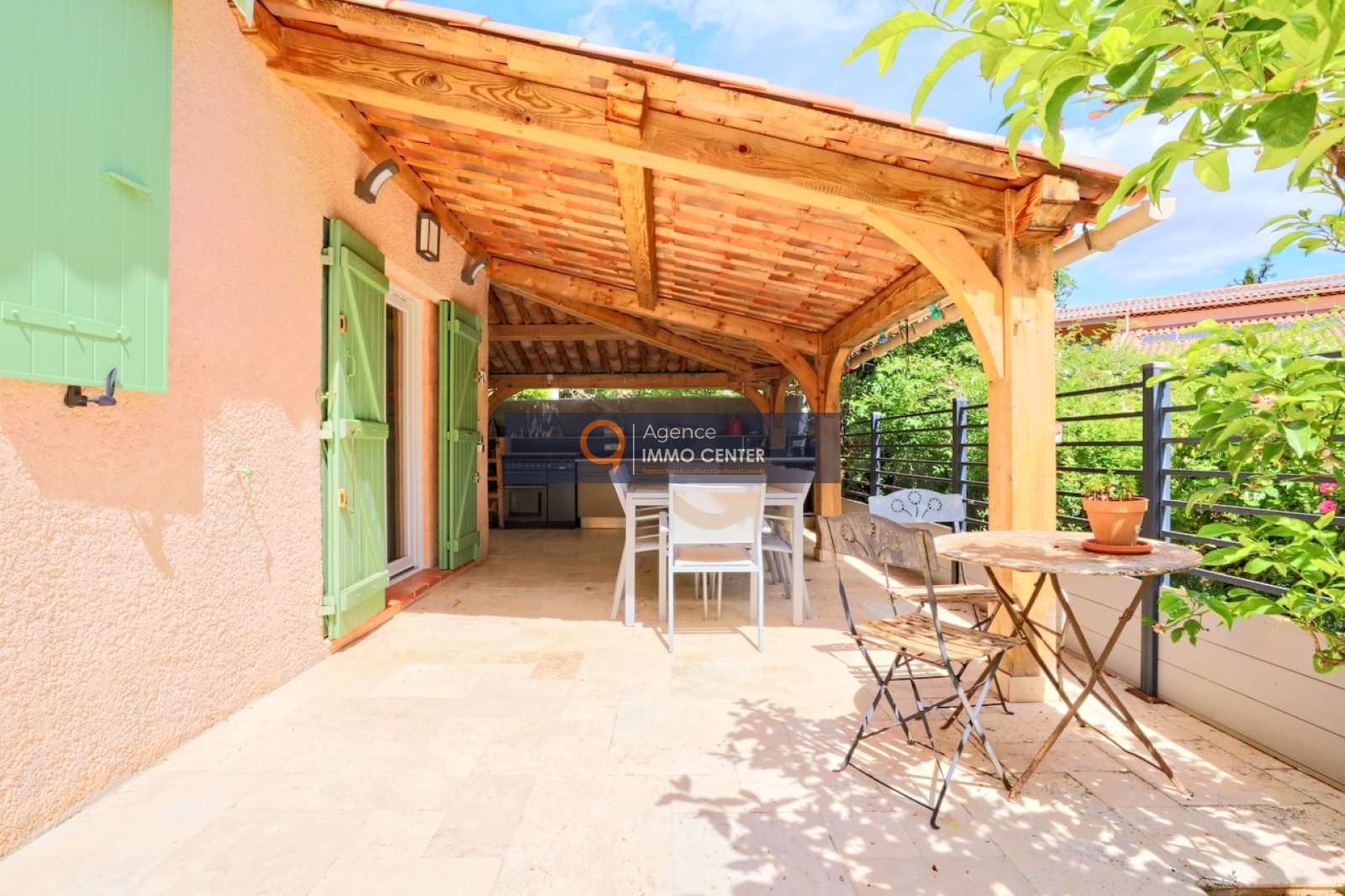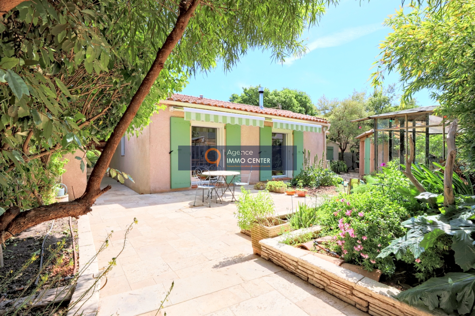 Solliès-Pont (83210)A Sollies-Pont, La Pépinière, au calme, lumineuse maison de type T4 de 100 m², de plain-pied, aux prestations de qualité, comprenant : cuisine équipée donnant sur salle à manger, salon avec poêle à bois, 3 chambres, salle d'eau, WC, buanderie et cellier sur une parcelle de 402 m² arboré d'essences méridionales avec bassin de 3x2 m chauffé, cuisine d'été, douche et WC extérieur, 4 dépendances et 2 places de parking, à proximité du coeur du village.