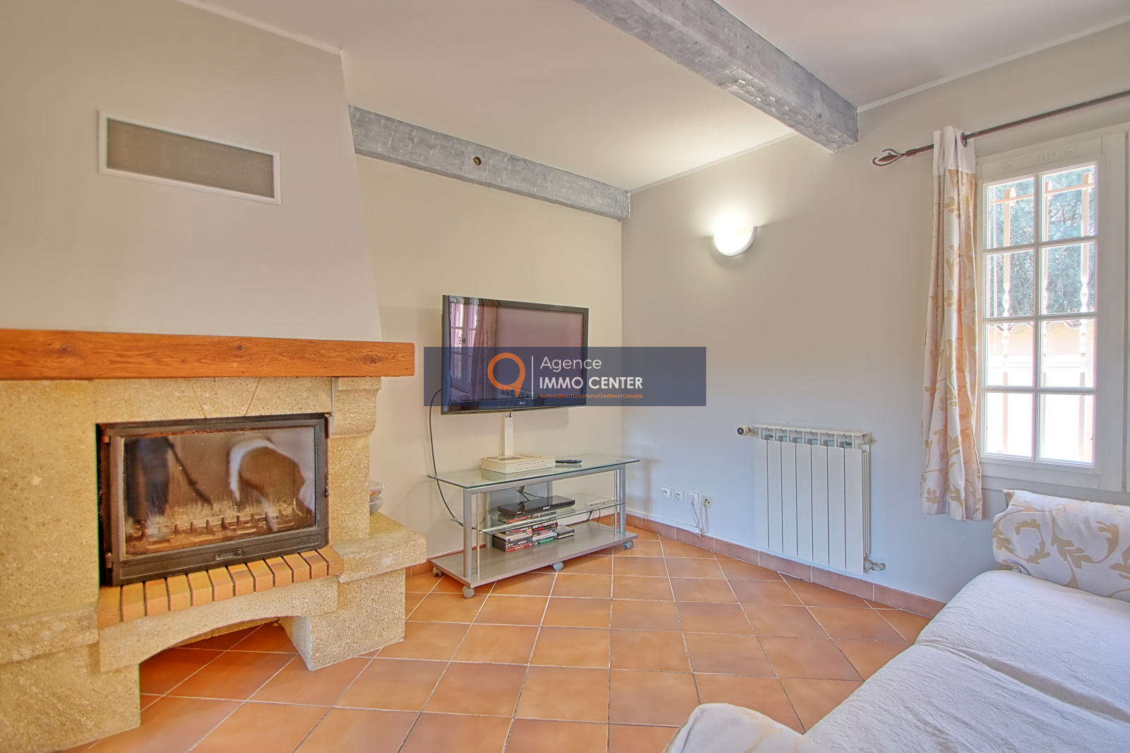 Un spacieux et lumineux salon de 36m², un espace salle à manger avec sa cheminée, une cuisine équipée légèrement séparée.