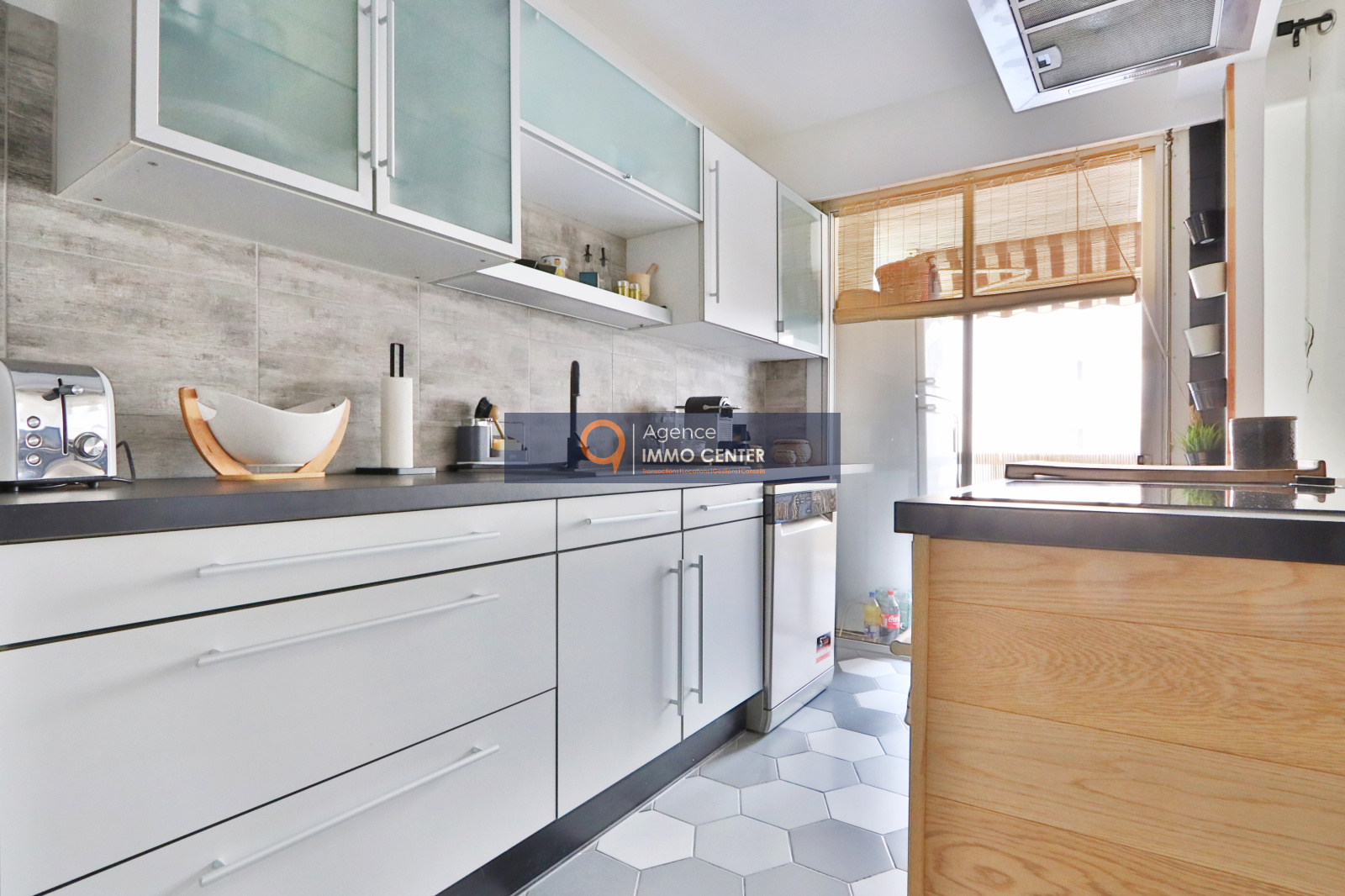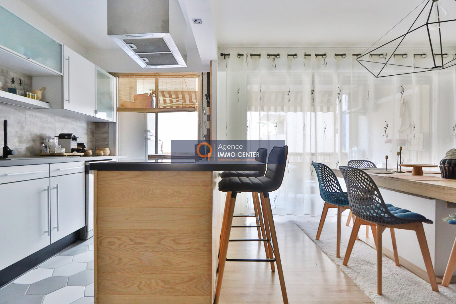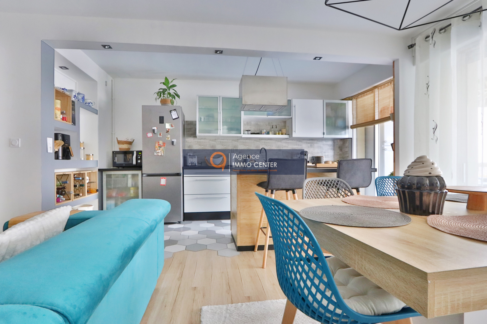 Nous trouvons un spacieux et lumineux salon avec son accès à la grande terrasse de 13m², une cuisine équipée moderne et ouverte sur le séjour.