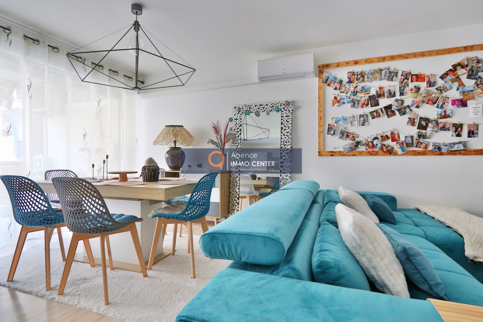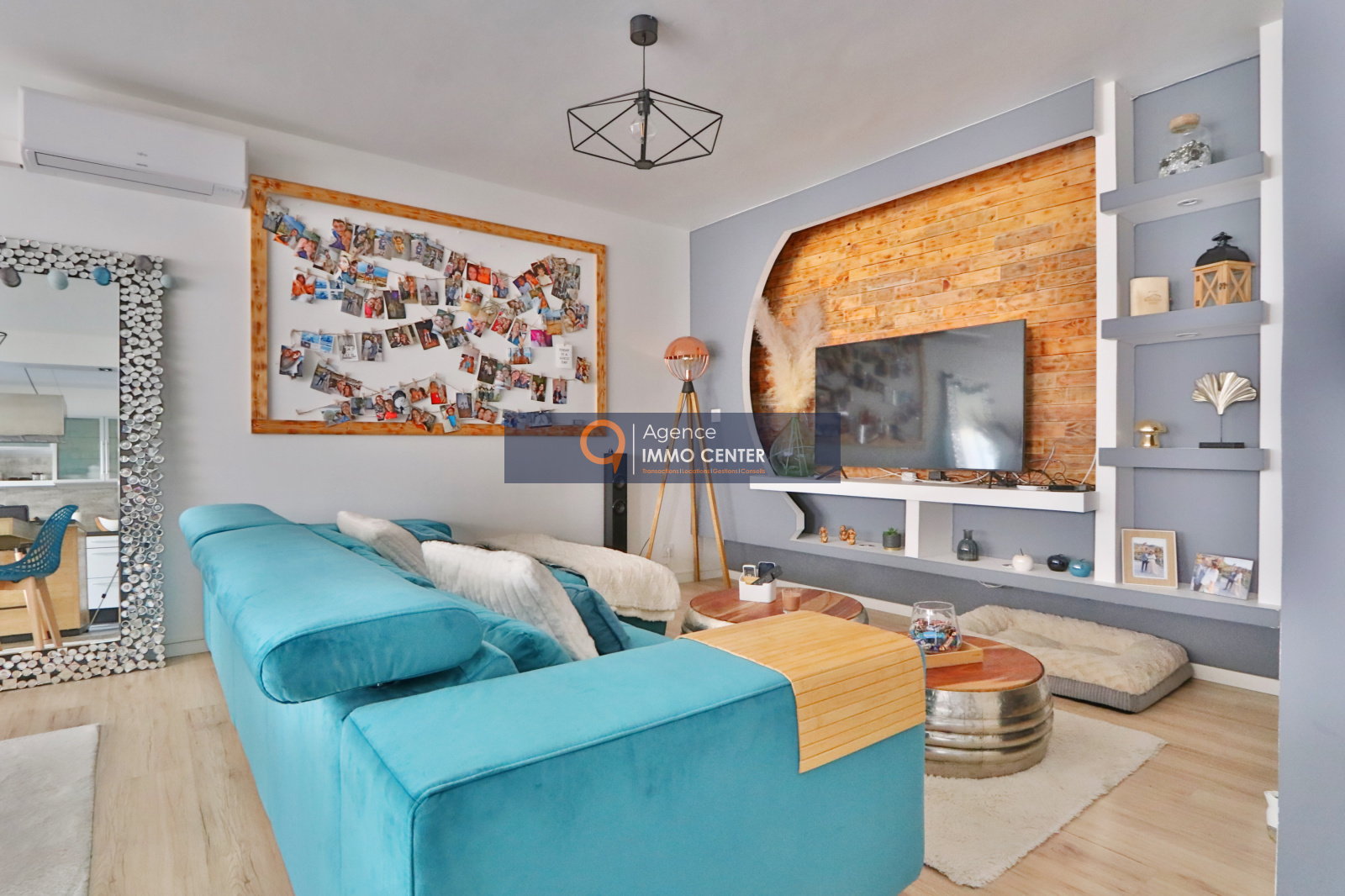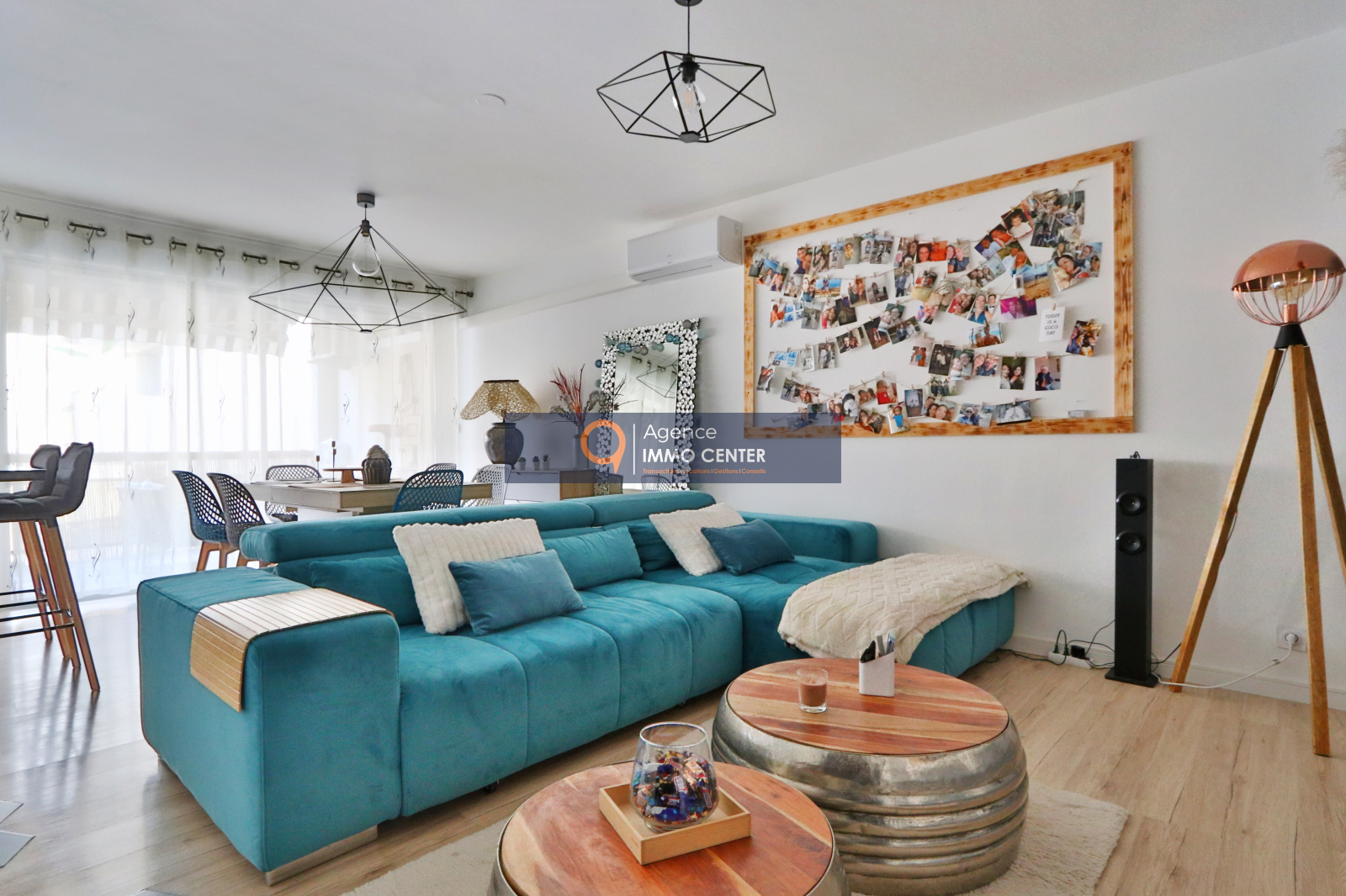 Nous trouvons un spacieux et lumineux salon avec son accès à la grande terrasse de 13m², une cuisine équipée moderne et ouverte sur le séjour.