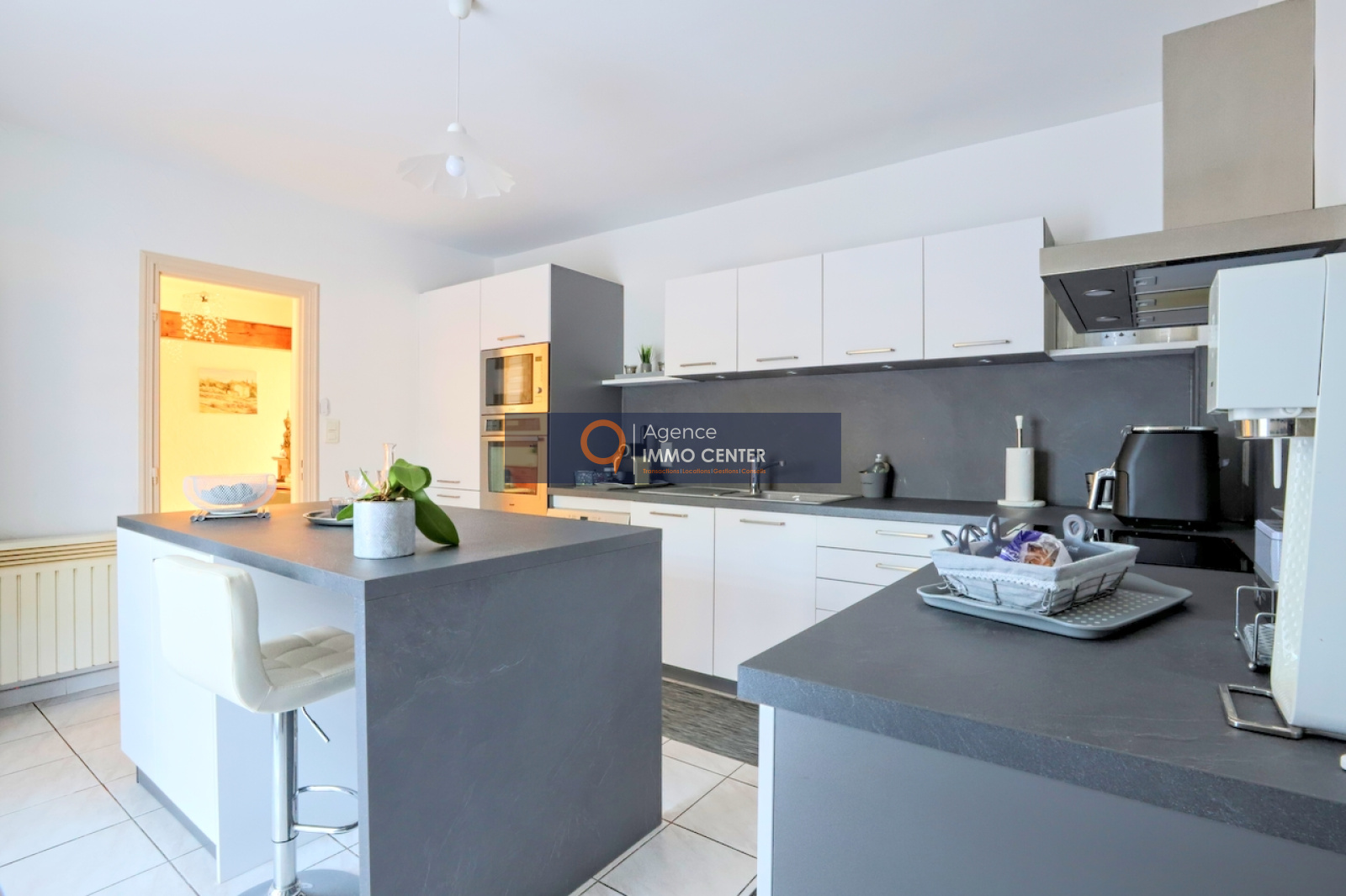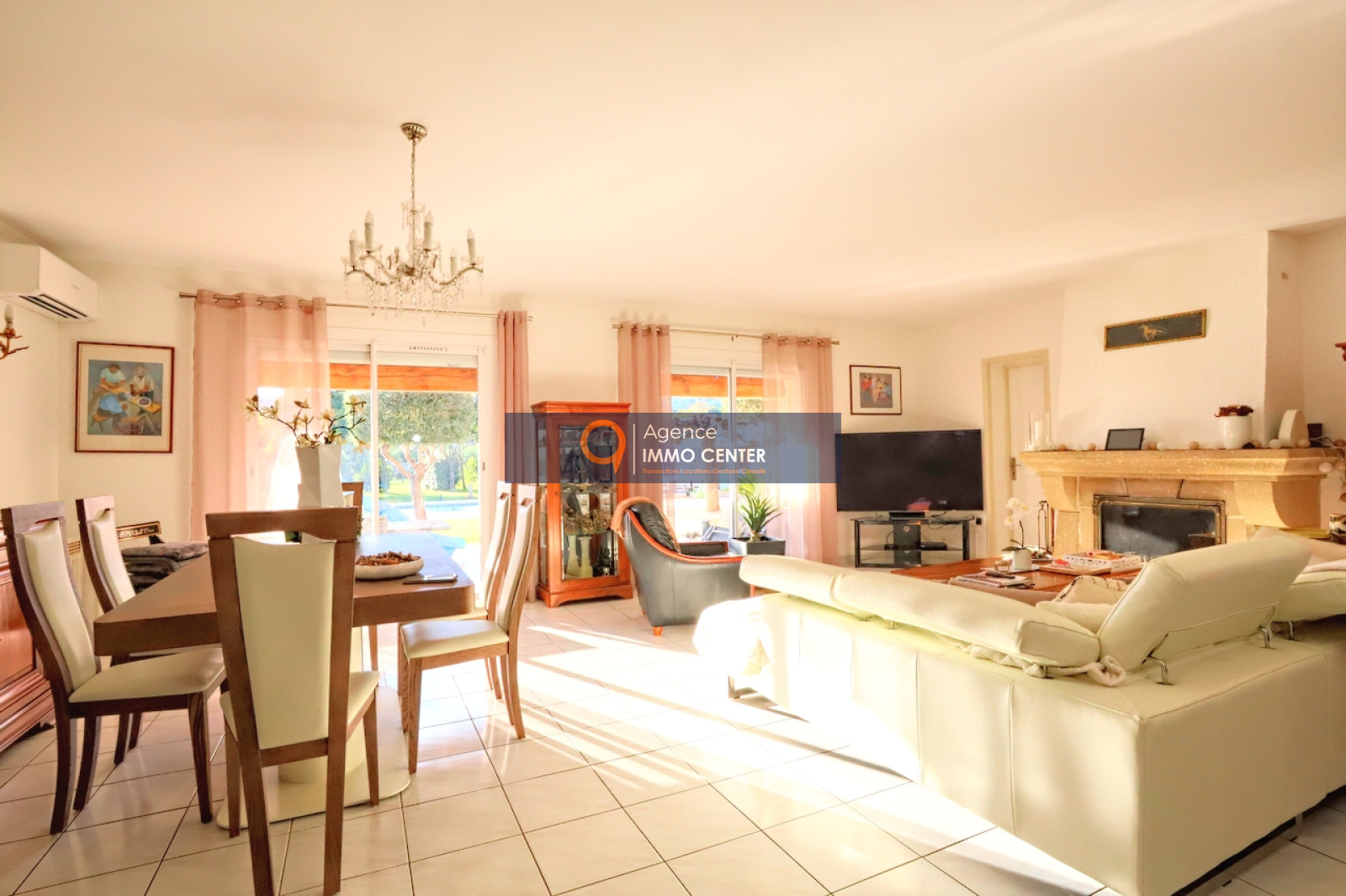 Nous trouvons un vaste et lumineux salon avec cheminée, une cuisine équipée légèrement séparée dans un esprit contemporain avec accès au cellier et au garage.